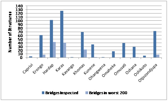 The annual budget for a five-year period as calculated by the BMS comes to: Routine Maintenance, N$8 100 000; Repairs N$12 300 000; Total N$20 400 000. Currently, only a fraction of this amount is spent on bridges due to lack of sufficient fund availability. Figures below provide statistics of the age distribution and condition of Namibia's different structures distributed across the Political Regions. As can be seen, the most structures are in the Karas region, followed by Hardap. Ohangwena and Kavango regions have the lowest number of structures.